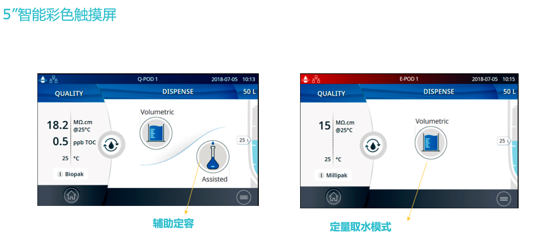 不需說明(míng)書(shū)就可(kě)完成所需的操作(zuò),取水(shuǐ)手臂5英寸的彩色觸摸屏,可(kě)以清楚看到純水(shuǐ)/超純水(shuǐ)的水(shuǐ)質,水(shuǐ)箱水(shuǐ)量等。需要的定量取水(shuǐ)功能和(hé)定容取水(shuǐ)功能點擊屏幕,設定體(tǐ)積就可(kě)完成。