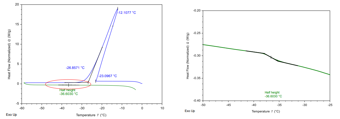 以圖2的DSC熱流曲線為(wèi)例,左圖是從10℃降溫到-60℃(藍(lán)色曲線),再升溫(綠色曲線)的過程。藍(lán)色曲線中可(kě)以看到非常明(míng)顯的水(shuǐ)的結晶放熱現象,将升溫曲線放大(dà)到右側可(kě)以看到明(míng)顯的台階式變化,即玻璃化轉變溫度Tg’=-36.6℃。