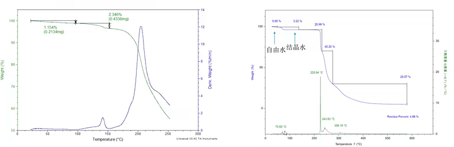 在TGA曲線中随着溫度升高(gāo),藥物在較低(dī)溫度緩慢失去自由水(shuǐ)(一般低(dī)于100℃);在特定的溫度/溫度範圍內(nèi)發生(shēng)台階式的變化失去結合水(shuǐ)。