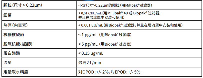 當純水(shuǐ)和(hé)超純水(shuǐ)的取水(shuǐ)口配有(yǒu)Millipak或Biopak終端精制(zhì)器(qì)時(shí),其他的參數(shù)可(kě)達到以下規格: