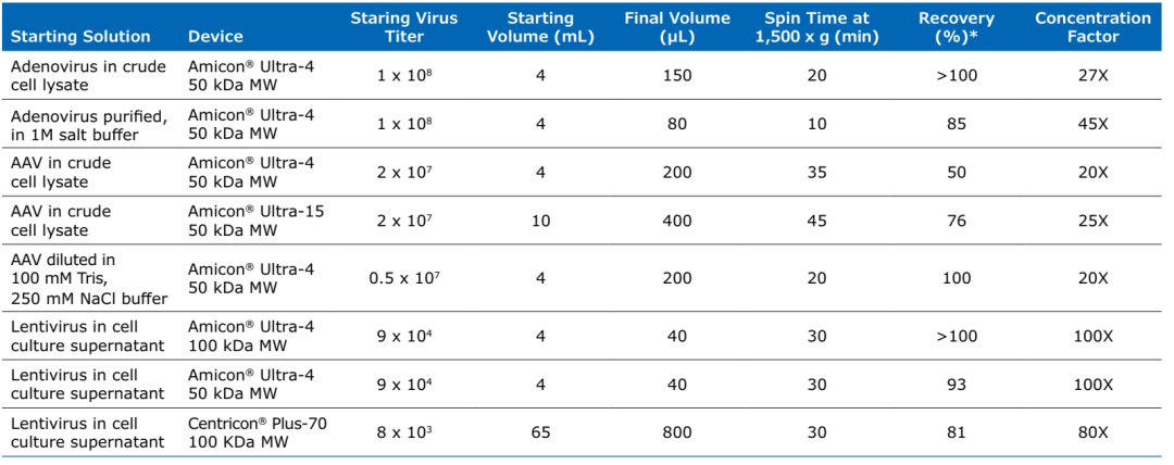 備注: 正确選擇設備、膜材料、MWCO、離心速度、離心時(shí)間(jiān)和(hé)緩沖液組成對于感染性病毒顆粒的高(gāo)回收率至關重要。