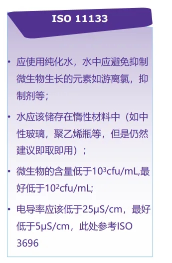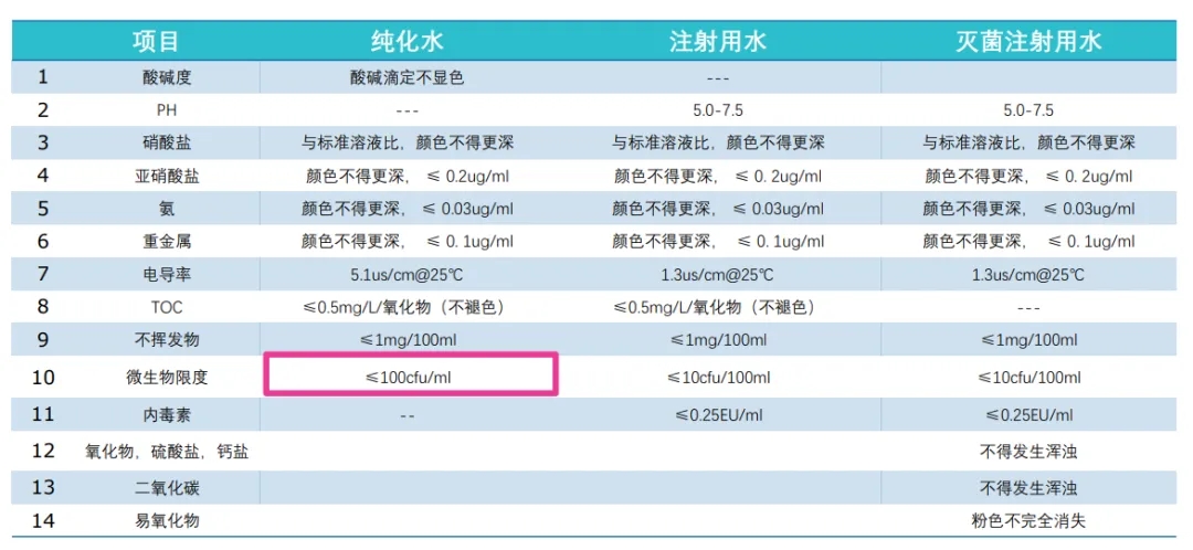 藥典将制(zhì)藥用水(shuǐ)分為(wèi)四類:飲用水(shuǐ),純化水(shuǐ),注射用水(shuǐ),無菌注射用水(shuǐ)。其中藥典規定了培養基的配置使用純化水(shuǐ),藥典二部中對純化水(shuǐ)的要求,其中對微生(shēng)物的檢測用水(shuǐ)以及配置培養基的純化水(shuǐ)的要求是以≤100 cfu/ml作(zuò)為(wèi)一個(gè)指标。