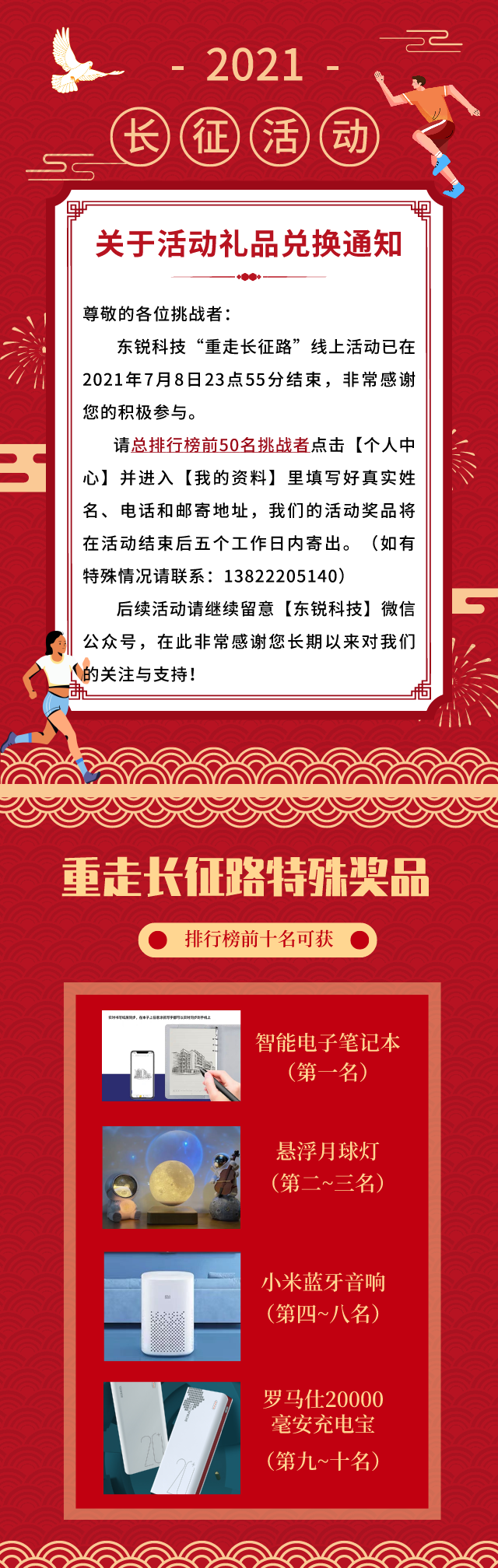 活動采取微信運動數(shù)據方式累計(jì)參與人(rén)員每日徒步裏程。活動截止後,完成全程長征路線者排行(xíng)榜前50名可(kě)獲得(de)小(xiǎo)禮物+紀念徽章。(排行(xíng)榜前10名的參與者将另外獲得(de)特殊禮品)