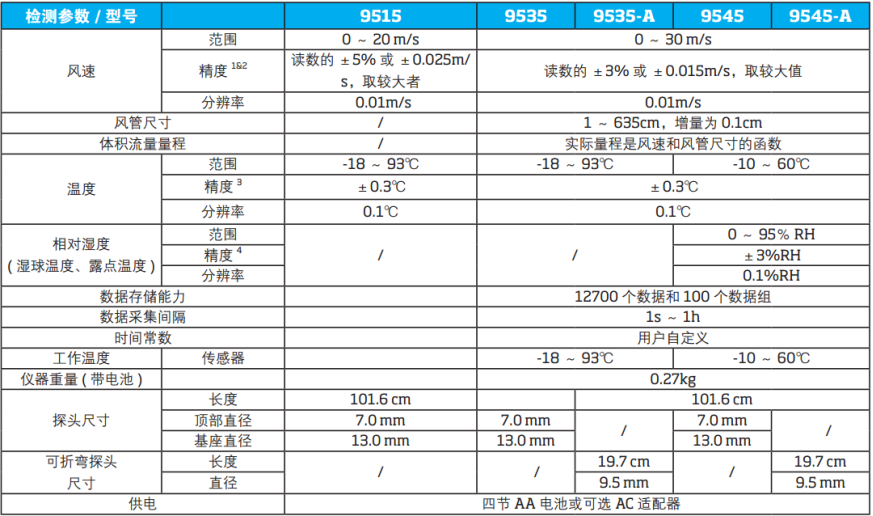 9535使用一個(gè)具有(yǒu)多(duō)個(gè)傳感器(qì)的探頭同時(shí)測量和(hé)記錄風速、 溫度和(hé)計(jì)算(suàn)風量